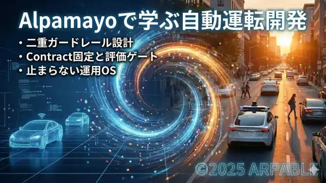 自動運転 Alpamayoで学ぶ推論型自動運転:「監視と検証」で成立させる設計手法 2026年1月12日 ケニー 狩野 https://arpable.com/wp-content/uploads/2025/01/アープロゴ.png Arpable 公開日:2026年1月13日 ※本記事は継続的に「最新情報にアップデート、読者支援機能の強化」を実施します(履歴は末尾参照)。 ※コード …