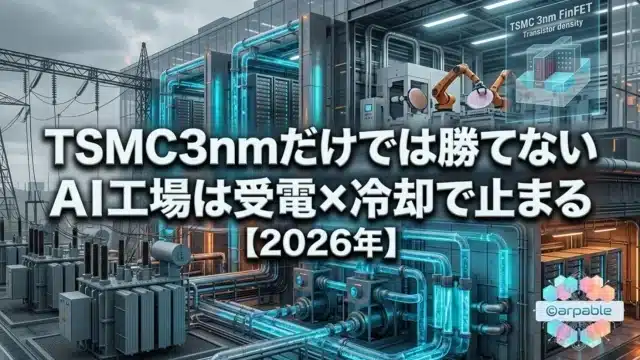 AIチップ TSMC3nmだけでは勝てない:AI工場は受電×冷却で止まる 2026年2月9日 ケニー 狩野 https://arpable.com/wp-content/uploads/2025/01/アープロゴ.png Arpable 最終更新:2026年2月9日 ※本記事は継続的に「最新情報にアップデート、読者支援機能の強化」を実施しています(履歴は末尾参照)。 …