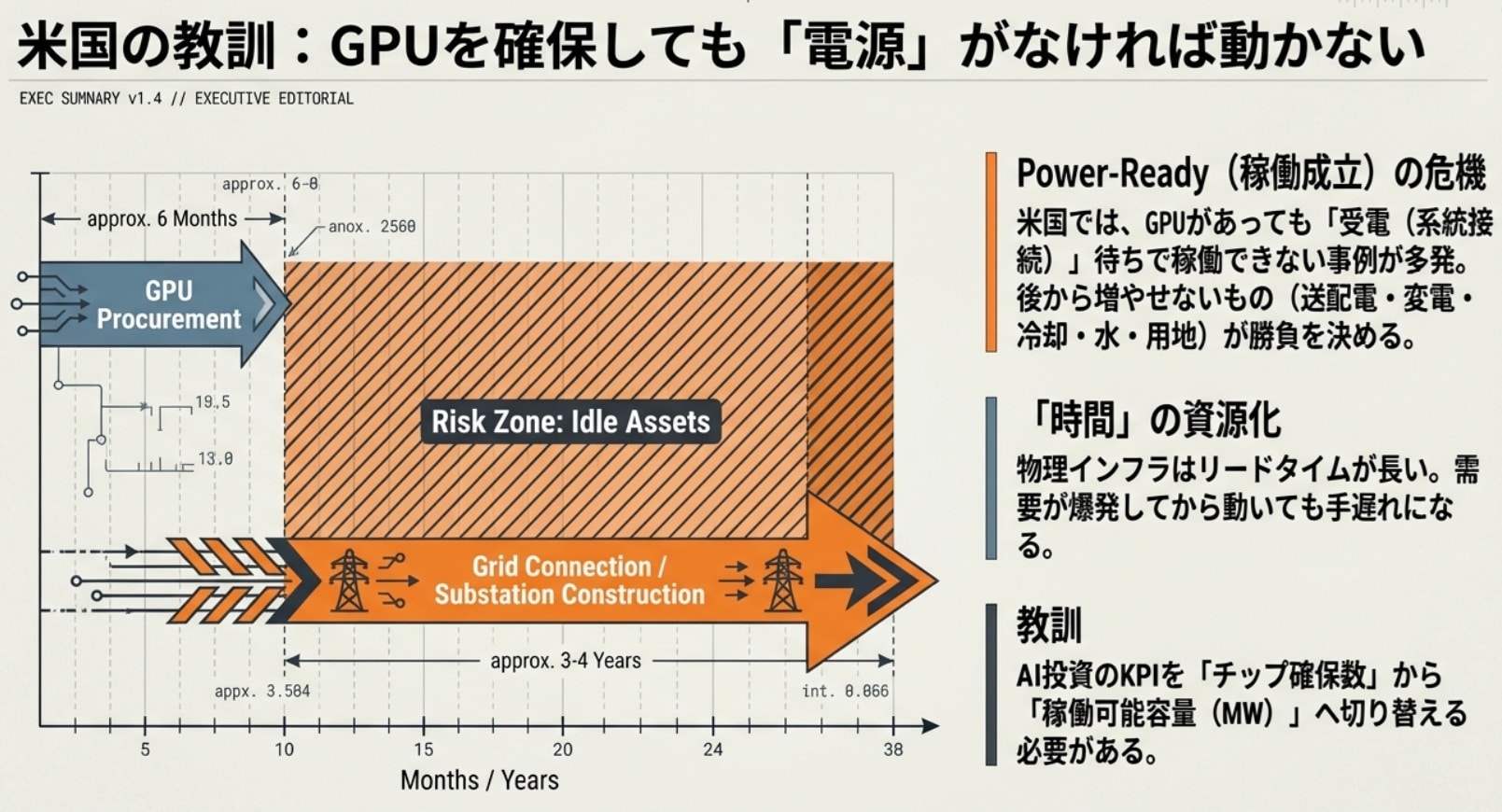 - 自社のAI計画は、GPU調達だけでなく受電(系統接続)・冷却・建屋まで含めて「稼働成立(Power-Ready)」を見積もれていますか。