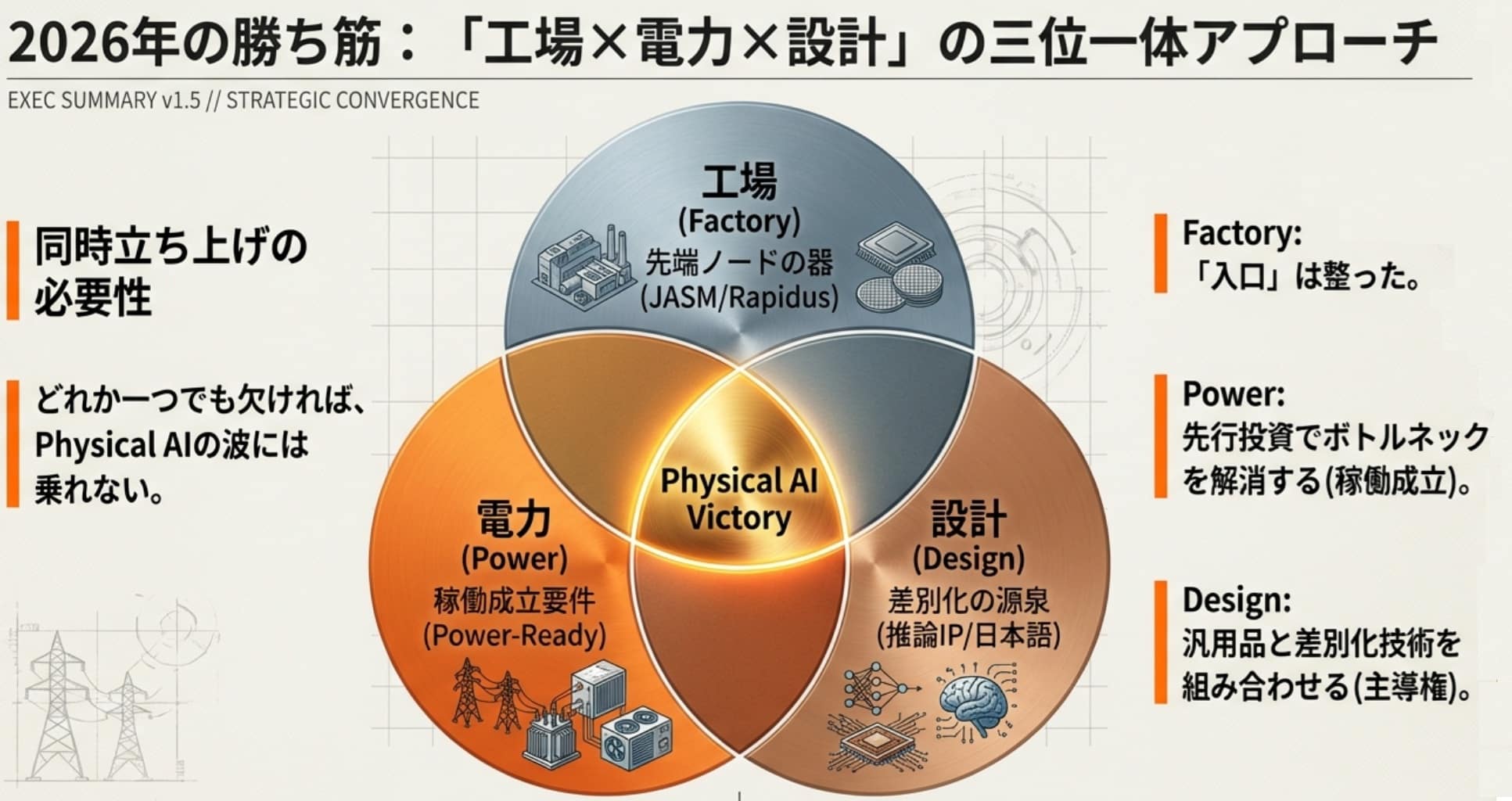 日本が17分野を繋ぐために必要なのは、これら異端児たちの設計思想を日本の製造現場の「暗黙知」と融合させることです。NVIDIAのGPUを使いこなしつつ、要所では日本の職人技を論理回路として焼き付けた独自の推論特化型ASICを国内で製造する。この柔軟な設計力こそが、17分野を一つに束ねる強力な磁場となります。