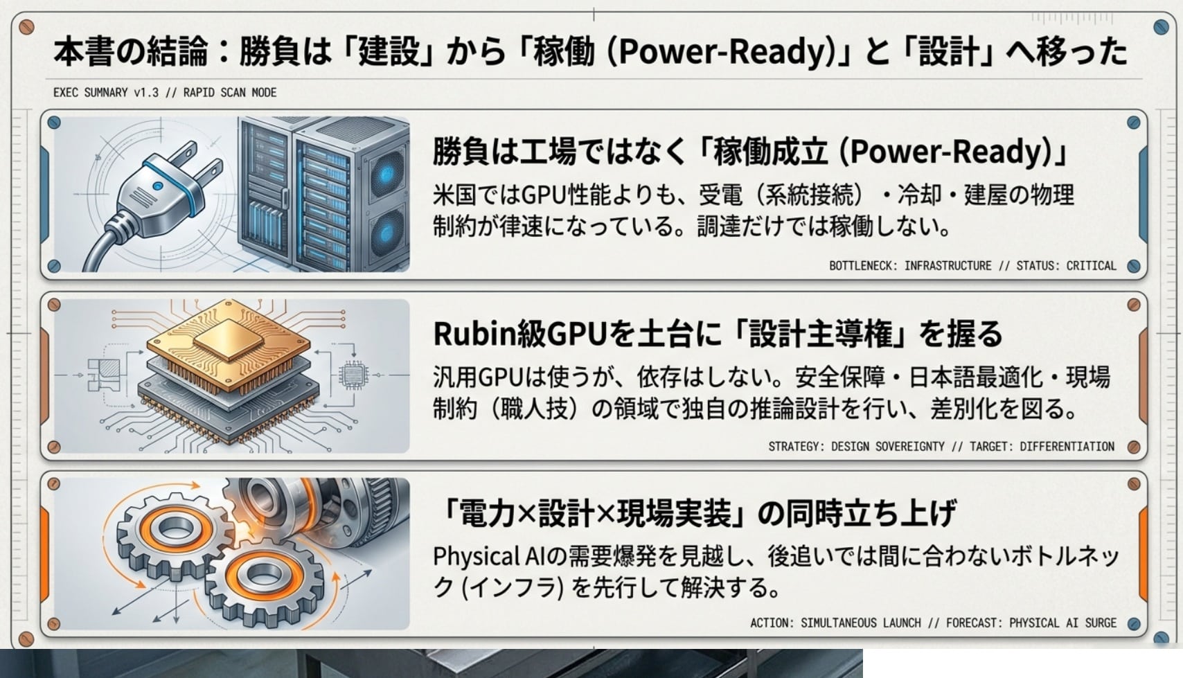 - 最適解は「設計・製造・電力」を同時に立ち上げることです:段階的に進めるほど、電力が律速となり、機会損失が拡大します。