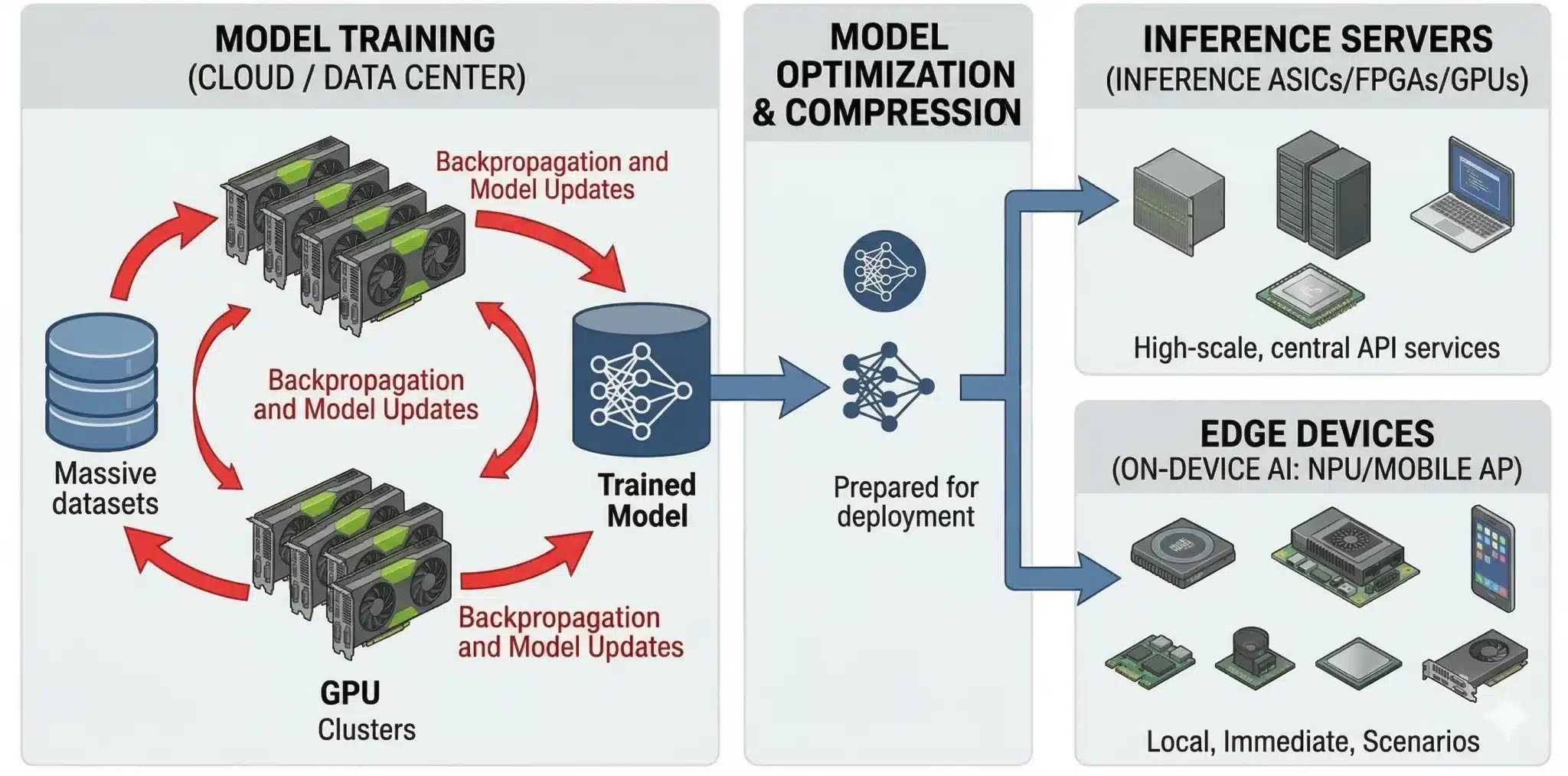 - 推論は完成済みモデルで答えるため、レイテンシ、電力効率、コストが主役になります。