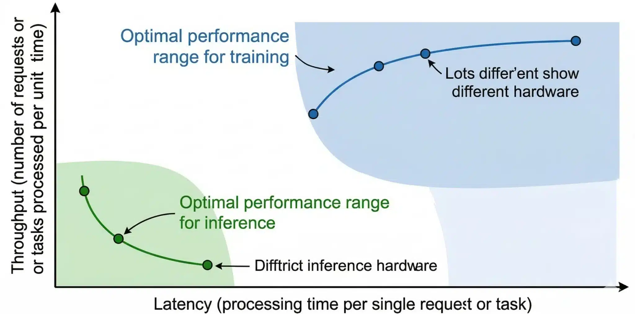 求められる指標が違うからです。学習はスループットと精度、推論はレイテンシと効率が主役になります。