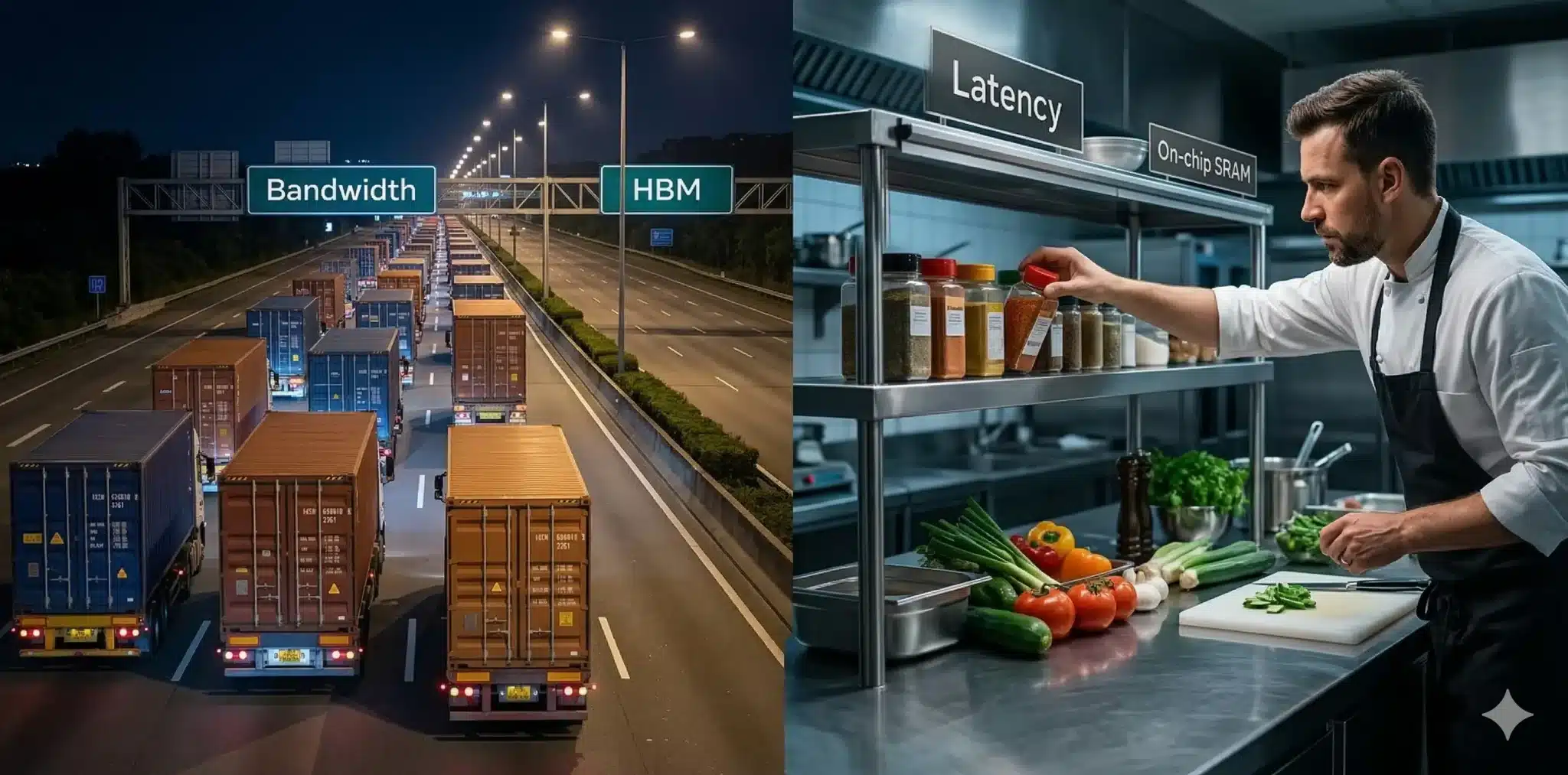 一方、推論では、どれだけ料理人が優秀でも、必要な食材が遠い倉庫にあると、そのたびに取りに行く時間がかかります。逆に、必要な材料が手元の棚にきれいに並んでいれば、動きは驚くほど速くなります。ここで重要なのは、倉庫全体の大きさではなく、必要なものがどれだけ近くにあるかです。