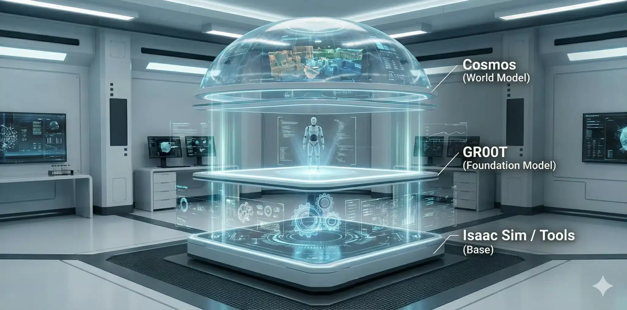 NVIDIAのロボット向けPhysical AIは、世界モデルCosmos、ロボット基盤モデルGR00T、シミュレータIsaacを中核に構成されます。