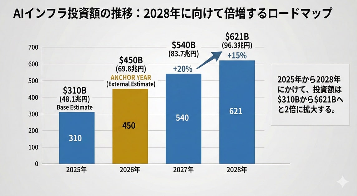 結論:AIインフラ投資は2025年の3,100億ドルから2028年には6,210億ドルへと、物理的な供給制約の中で拡大し続けます。