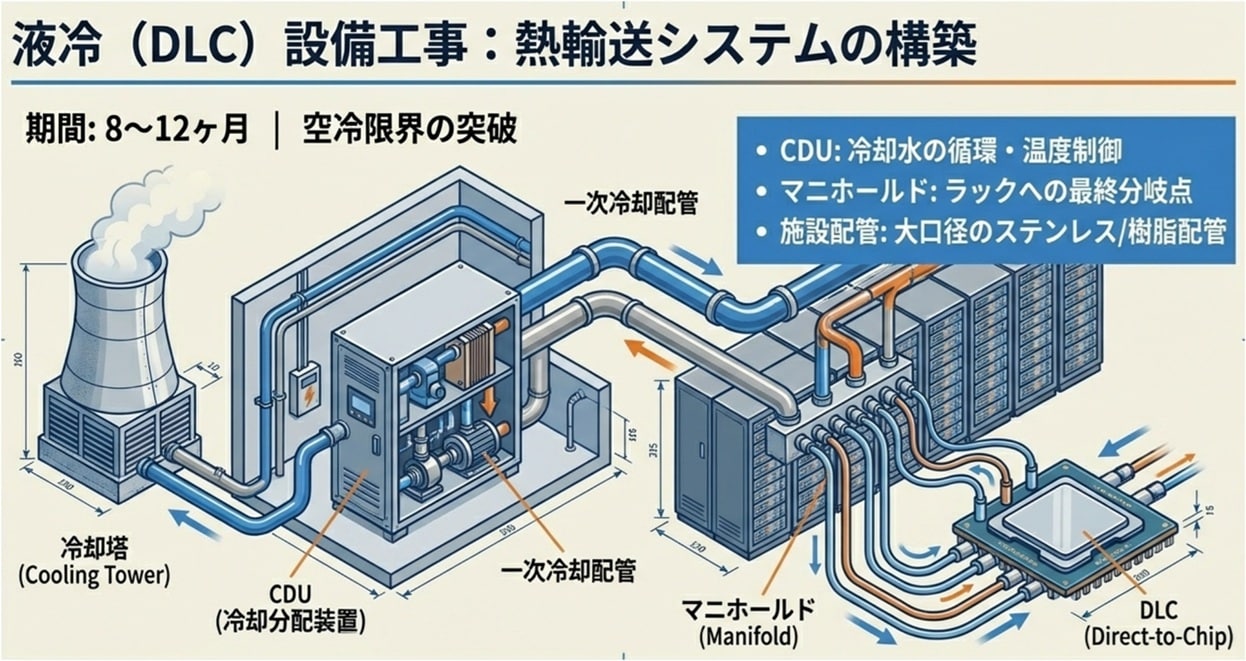 高密度GPUクラスタは発熱密度が高く、従来型の空冷前提の設備設計では限界が生じます。液冷(DLC)やCDU、配管、熱交換といった機械設備が“標準装備”になりつつあり、投資の重心が移動します。 - 土地・建物(床荷重・建設工期・許認可):