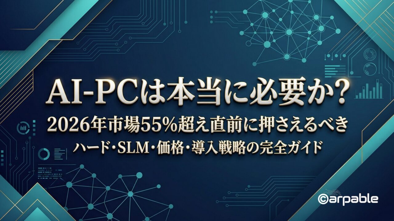 「次のPC更新でAI-PCにすべきか」「企業でAI-PCをいつ・どう導入すべきか」──この2つの問いに答えるため、本記事ではNPUアーキテクチャの実態、ローカルで動くSLMの選び方、Intel/AMD/Qualcomm/Appleの戦略比較、日本市場の価格動向、そして業種・用途別の導入判断マトリクスまでを一本で網羅します。2026年にはPC市場の過半数がAI-PCへ切り替わる転換点を目前に控え、今動くべき理由と、まだ待てる理由の両面から整理します。