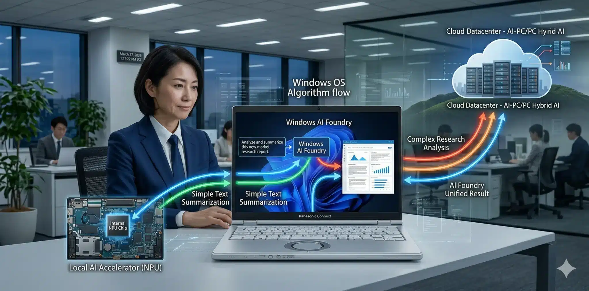ユーザーがプロンプトを入力すると、OSがタスクの難易度を推定し、単純なものはNPUでローカル処理、高度な推論が必要と判断した場合のみバックグラウンドでクラウドへルーティングします。