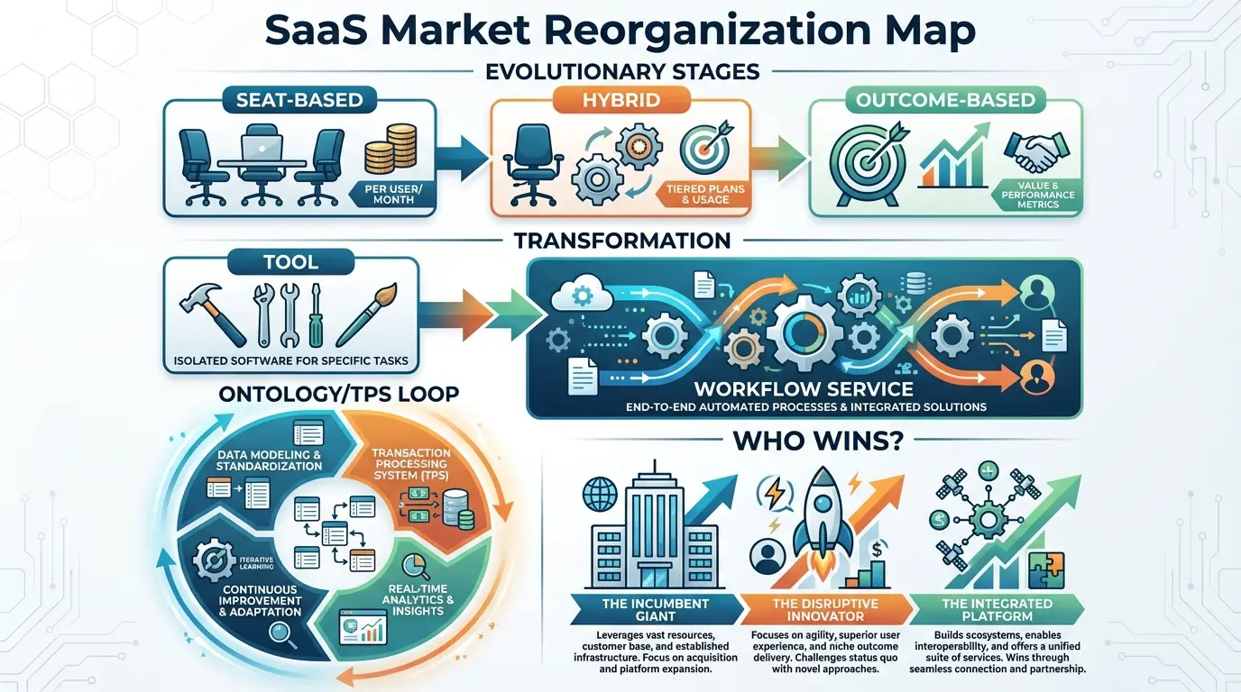 まず前提として、SaaS市場の再編は「突然の価格改定」から始まるのではなく、仕事の実行主体が「人のUI操作」から「ソフトの自動実行」へ移るところから始まります。次章では、その変化を「3つの型」へ接続できる形で整理します。