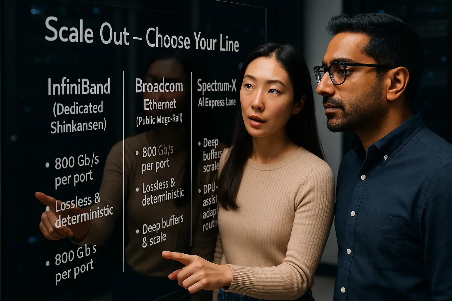 スケールアウト(ラック間):都市間交通をどう敷くかが学習時間を左右します。専用新幹線=InfiniBandは最短時間を狙え、公共の超巨大鉄道=ブロードコム系Ethernetは運用資産と規模のしなやかさが強みです。