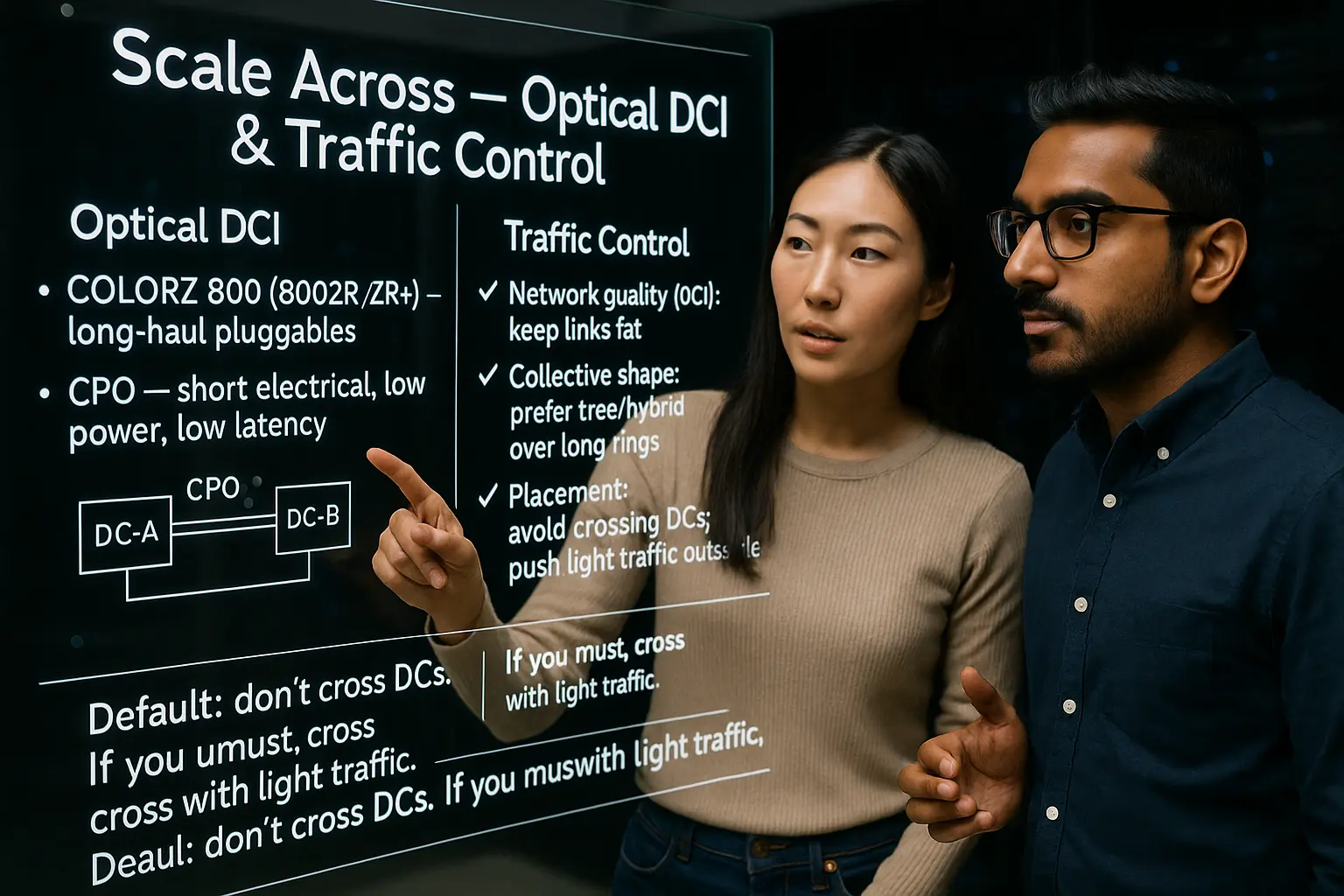 レオ:「ポイントは三つ。物理ネットワーク(DCI)の品質、集団通信(All-Reduce/All-to-Allなど)の組み方、そしてジョブやデータの配置。原則は“跨がない”設計で、跨がざるを得ない時は軽い通信を外側に寄せるのがコツだね。」