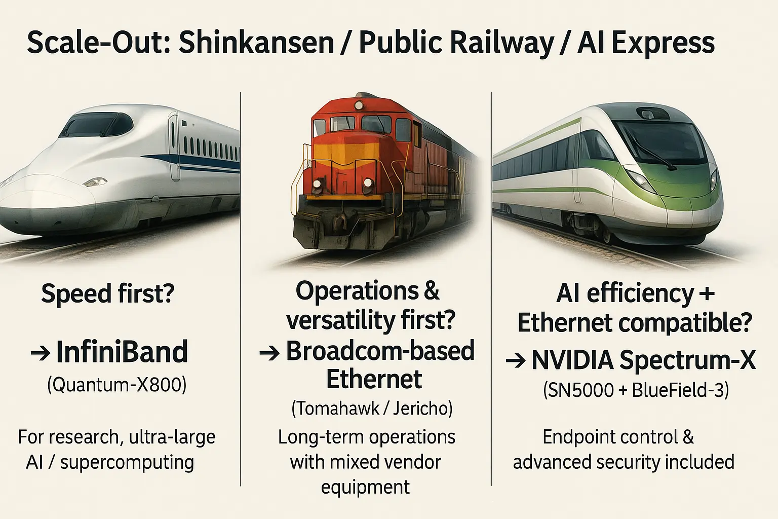 専用新幹線=InfiniBand、公共巨大鉄道=Broadcom系Ethernet、AI特急レーン=Spectrum-X。