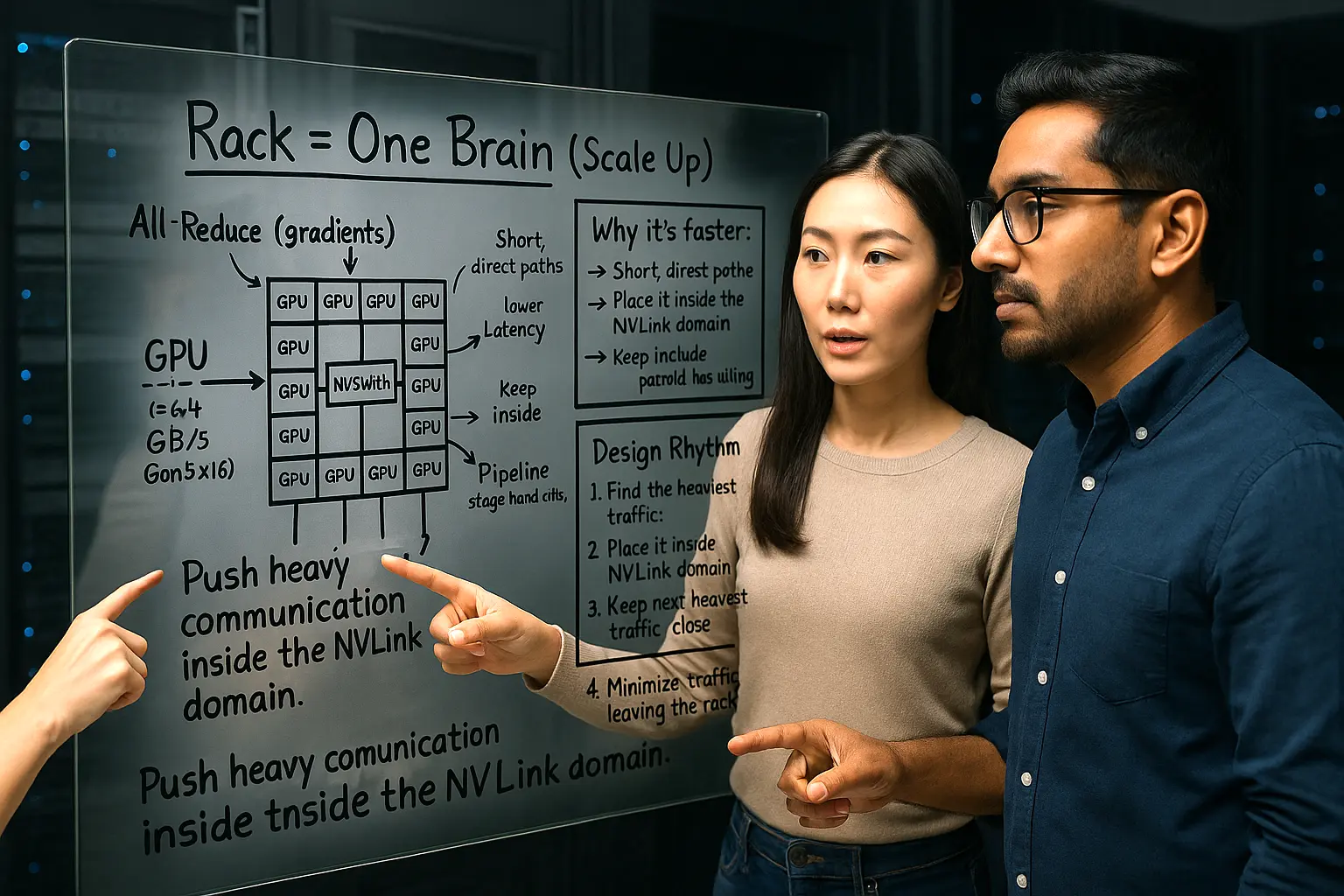 AIインフラでは、最も重い通信をNVLinkドメイン(同一ラック)に集約するのが定石です。通信階層を整理し、帯域最適化・遅延低減を先に固めれば、後段(スケールアウト)の設計が一気に楽になります。