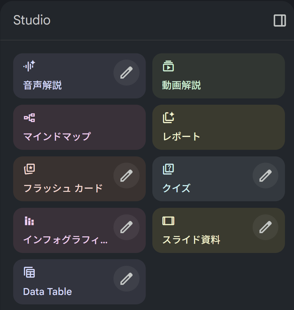 NotebookLMの右サイドバーに配置されている「Studio(ソース管理パネル)」は、アップロードした資料を基に、様々な形式のコンテンツを自動生成する強力な機能群です。AIが資料を解析し、学習・プレゼン・共有に最適なフォーマットで出力します。