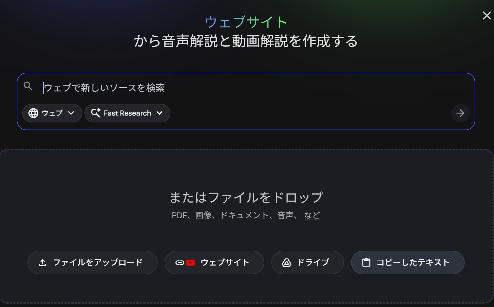 - URL入力:YouTube動画のURL、Webページのリンク、Googleドキュメントのリンクをコピーしてペースト