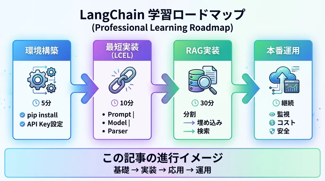 - 最短ルート:LCEL(パイプ構文)で「Prompt → Model → Parser」をまず1本通し、そこにRAGとツールを足す。