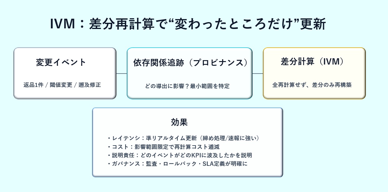 - 要点2:返品・遡及修正へ差分再計算(IVM:Incremental View Maintenance)で準リアルタイム追随、速報性とコストを両立。