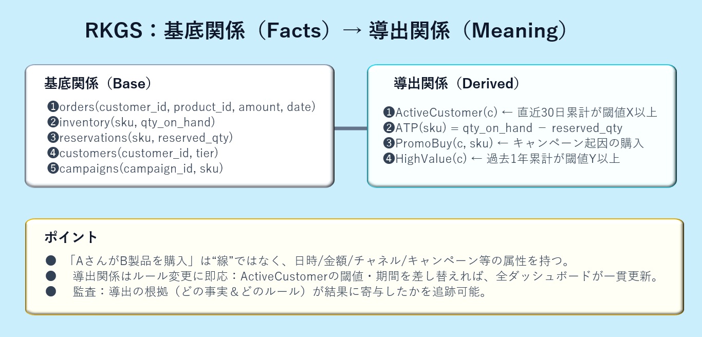 要約:RKGSは事実(ベース関係)と意味(導出関係)を同じ基盤で管理。ダッシュボード不一致を定義差として可視化します。