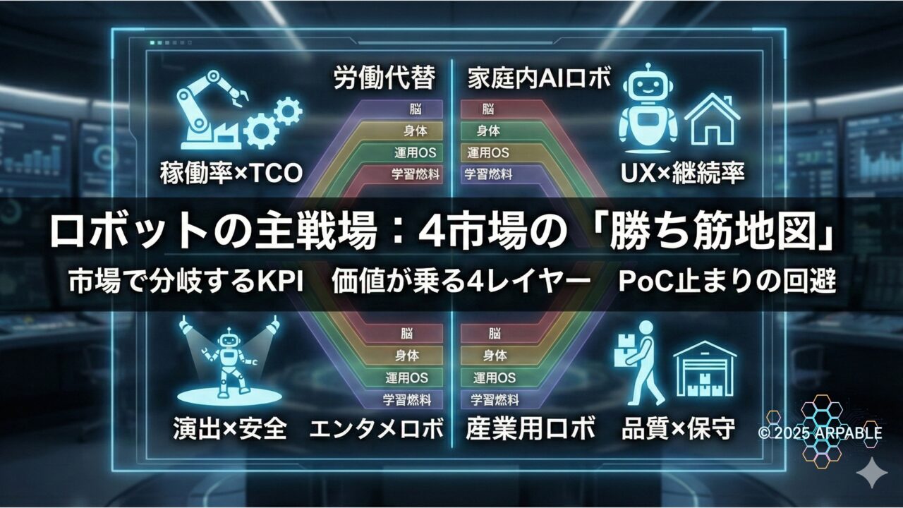 読み方:同じ「ロボット」でも、勝ち筋は市場ごとに違います。どのKPIが支配的かと、4レイヤーのどこに価値が乗るかを押さえると、投資・事業・技術の議論がブレません。