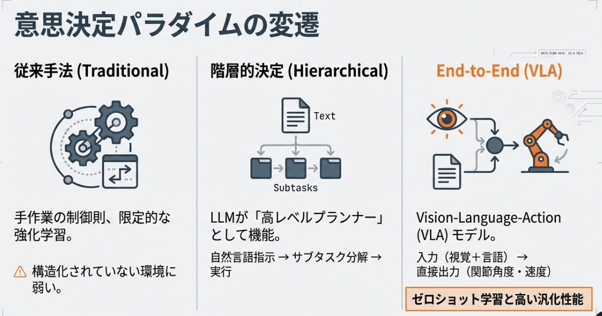 これは、飛んできたボールに対して「腕を何度にして…」などと考えずに反応する、熟練アスリートの反射神経に似ています。「見た瞬間に、身体が最適解を選んで動く」。この直感こそが、不確実な現実世界で滑らかな動きを実現する鍵となります。一方でLLMは、その直感が迷わないように「目的と段取り(作戦)」を組み立てる役です。