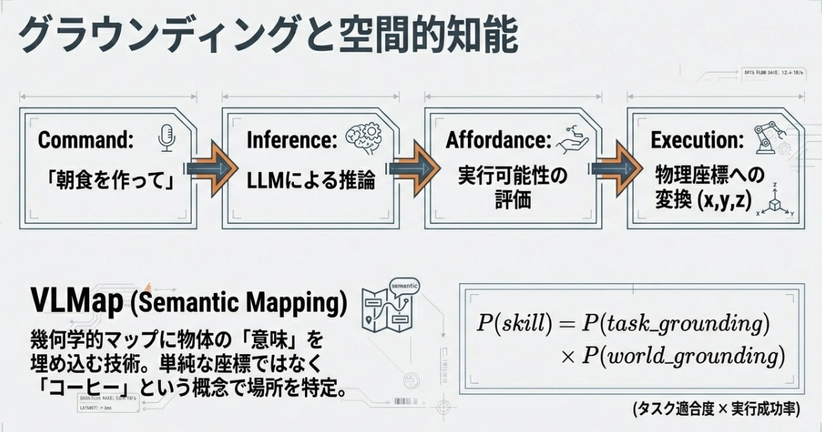 「指示に対する意味的な正しさ(Intent)」と、「現在の環境と自身のスペックで物理的に可能か(Feasibility)」。この二つの確率を掛け合わせ、一定の閾値を超えたときのみ、モーターへ電流が流れます。このアフォーダンス評価という安全弁こそが、AIを信頼できる「相棒」へと昇華させるのです。(要するに「言葉として正しい」だけでは動かさず、「身体として可能」までチェックしてから動かす、という話です。)