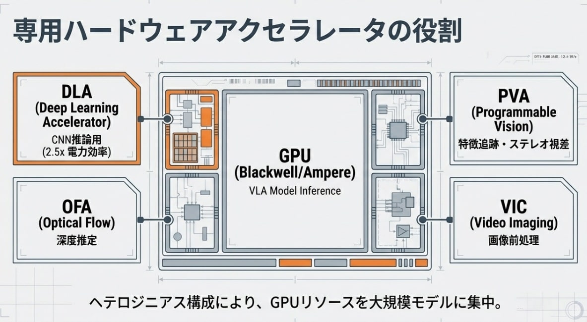 ロボットには電力と発熱の厳しい制約があります。ただGPUをフル回転させるだけでは、すぐにバッテリーが尽き、機体はオーバーヒートしてしまいます。Jetsonの真の凄さは、脳の中に視覚野や運動野があるように、「得意分野で分担する」インフラ設計にあります。以下は要するに「GPU=重い推論」「DLA=省電力の推論係」「PVA/OFA=映像の下ごしらえ係」という役割分担です。
