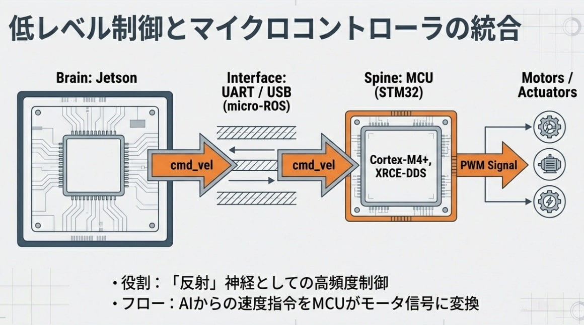 強力な脳(Jetson Thor)だけでは、ロボットは動きません。人間が「熱い」と感じて手を引くとき、脳まで信号が届く前に脊髄で反射が起きるように、ロボットにもミリ秒単位の「反射神経」が必要です。この「高次の思考(SoC)」と「物理的な駆動(MCU)」をどう同期させるか。ここに、ロボティクス・インフラの真髄があります。