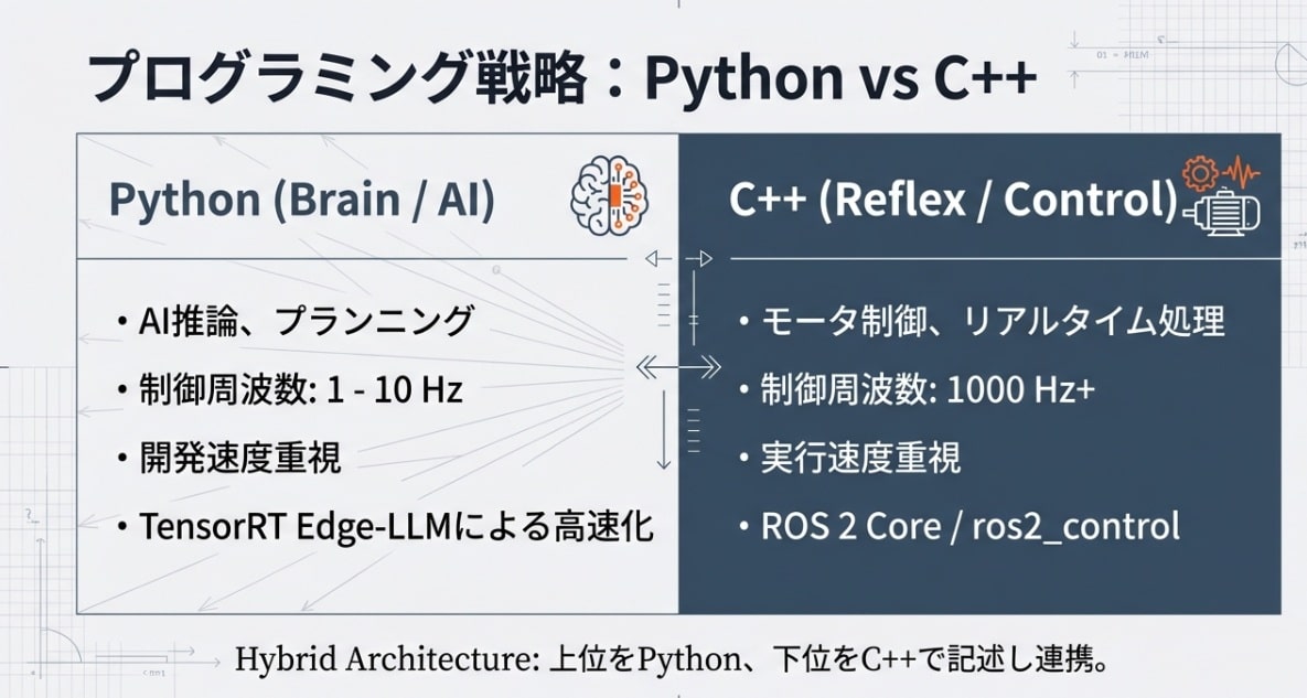 「AIロボットをどう書くか?」という問いに対し、報告書は非常に実践的な答えを示しています。それは、脳と反射の構造をプログラミング言語の使い分けにそのまま投影することです。身体性AIの現場では、単一の言語に固執することは許されません。