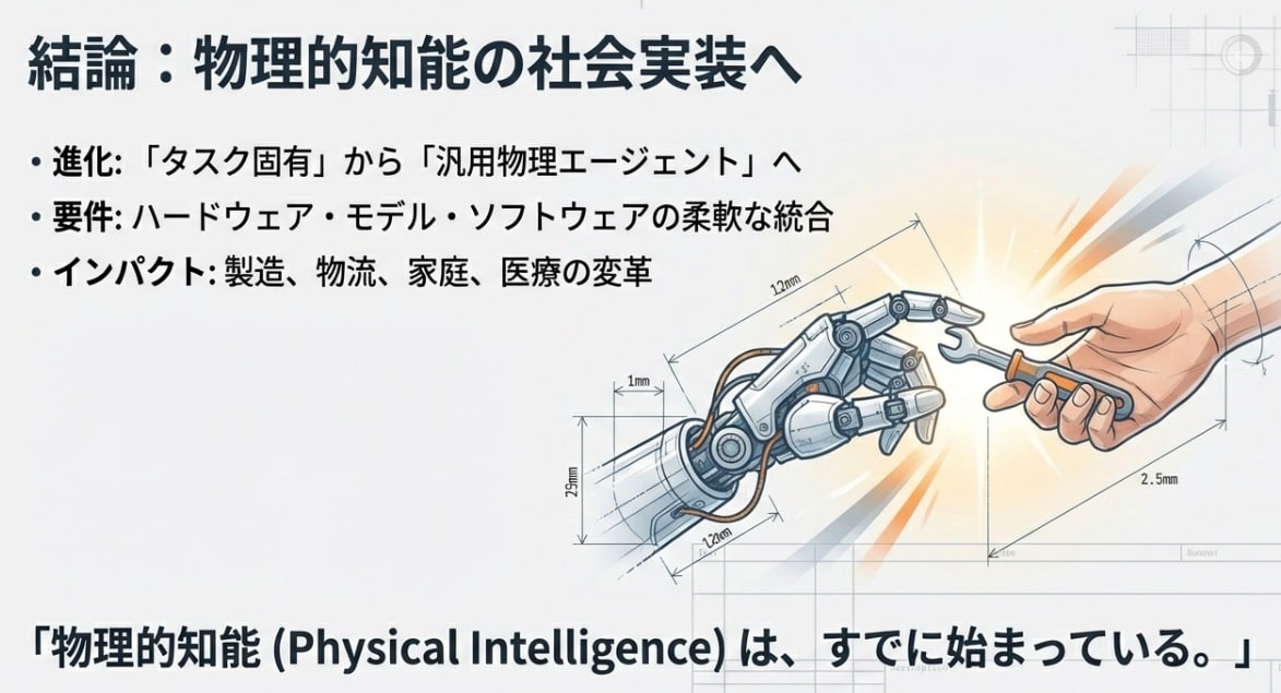 2026年、身体性AIは「特定の作業をこなす機械」から、私たちの意図を汲み取り、物理的な制約を自ら乗り越えて目的を達成する「真のパートナー」へと変貌を遂げようとしています。