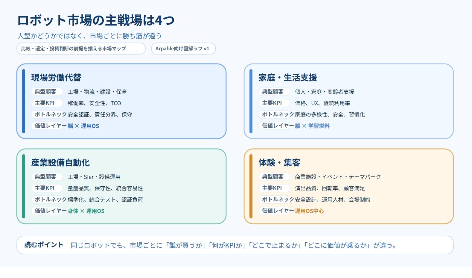ロボット市場は4つに分岐し、勝ち筋はKPIとボトルネック、そして価値が乗るレイヤーで決まります。