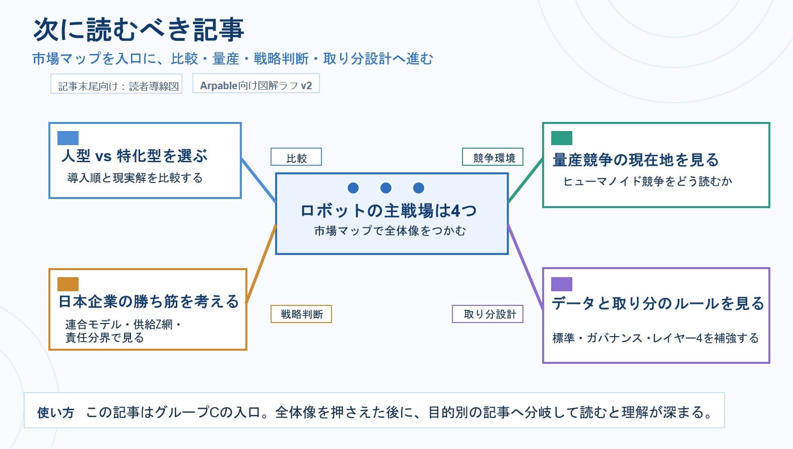 また、日本企業の勝ち筋を具体例で見たい場合は、協働ヒューマノイド連合/投資家分析もあわせて読むと、供給網と責任分界の視点が補強されます。