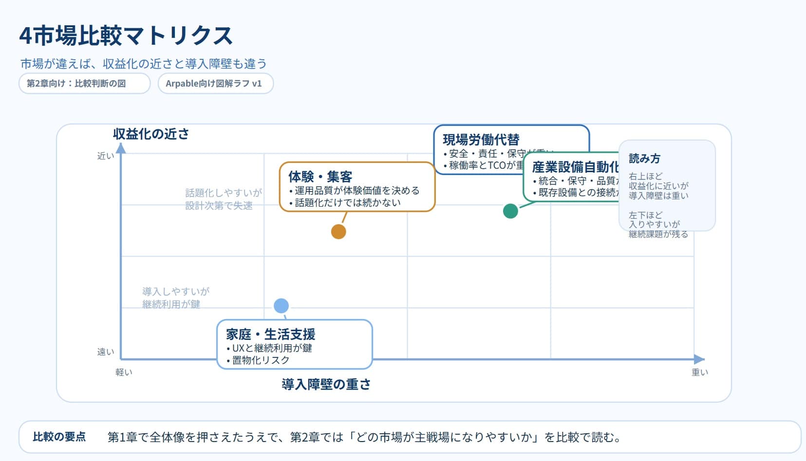 同じ「ロボット」でも、現場労働代替と家庭・生活支援では意思決定の論理が違います。市場により誰が買うのか、何で勝つのか、何で止まるのかが変わり、その結果として価値が乗る場所もズレるのです。