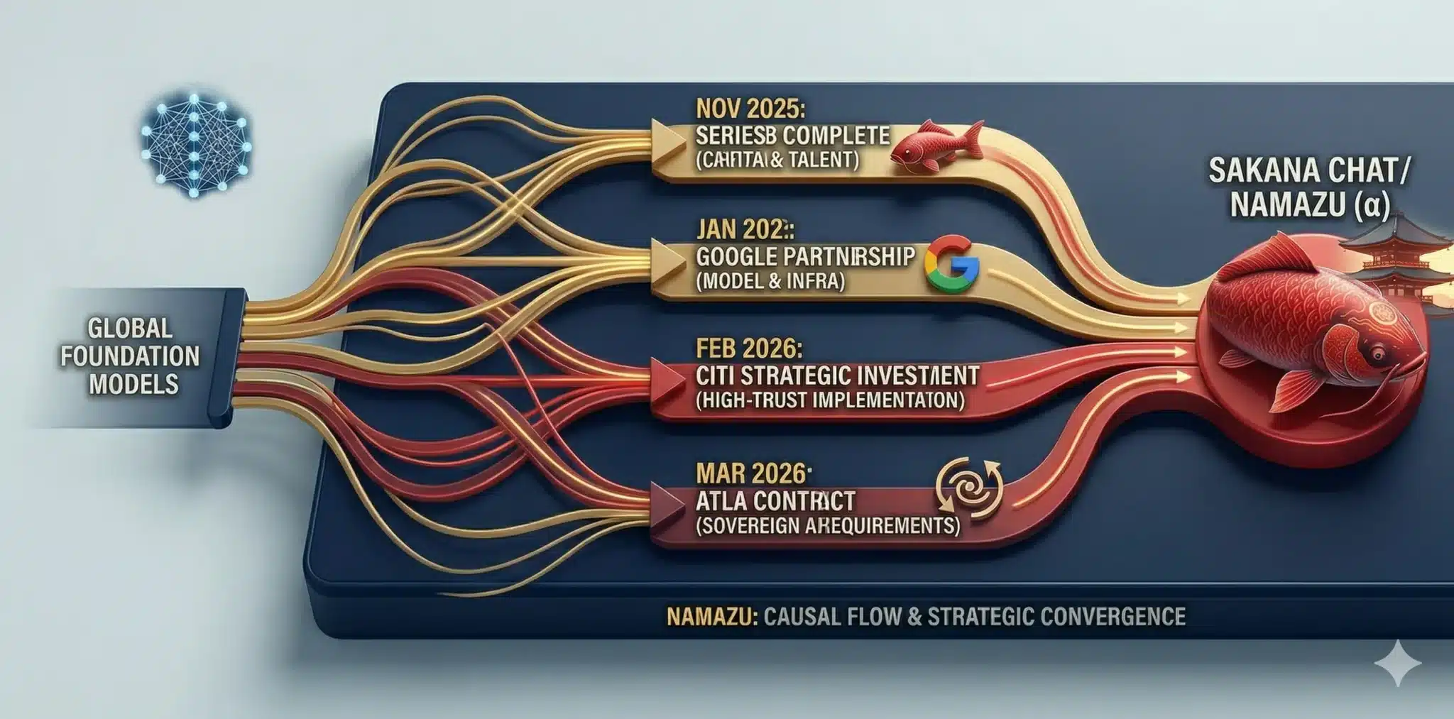 実際、Sakana AIの最近の動きを見ると、この路線は言葉だけではありません。2026年のGoogleとの戦略提携、Citiの戦略投資、2025年から続くMUFGとの包括的パートナーシップ、2026年3月に始まった防衛装備庁系の委託研究、そしてSakana Chatの公開。これらをまとめて見ると、Namazuは「Sakana AIの新モデル」ではなく、日本のAI戦略を現実のサービスへ接続する試作品として読むことができます。