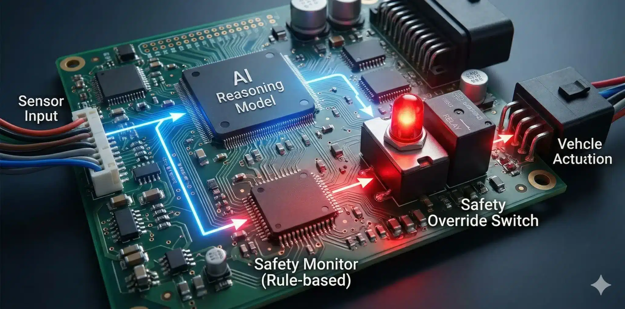 - 推論系(判断)と監視系(検証)を分離し、危険・遅延・分布外なら安全動作へ強制する設計。