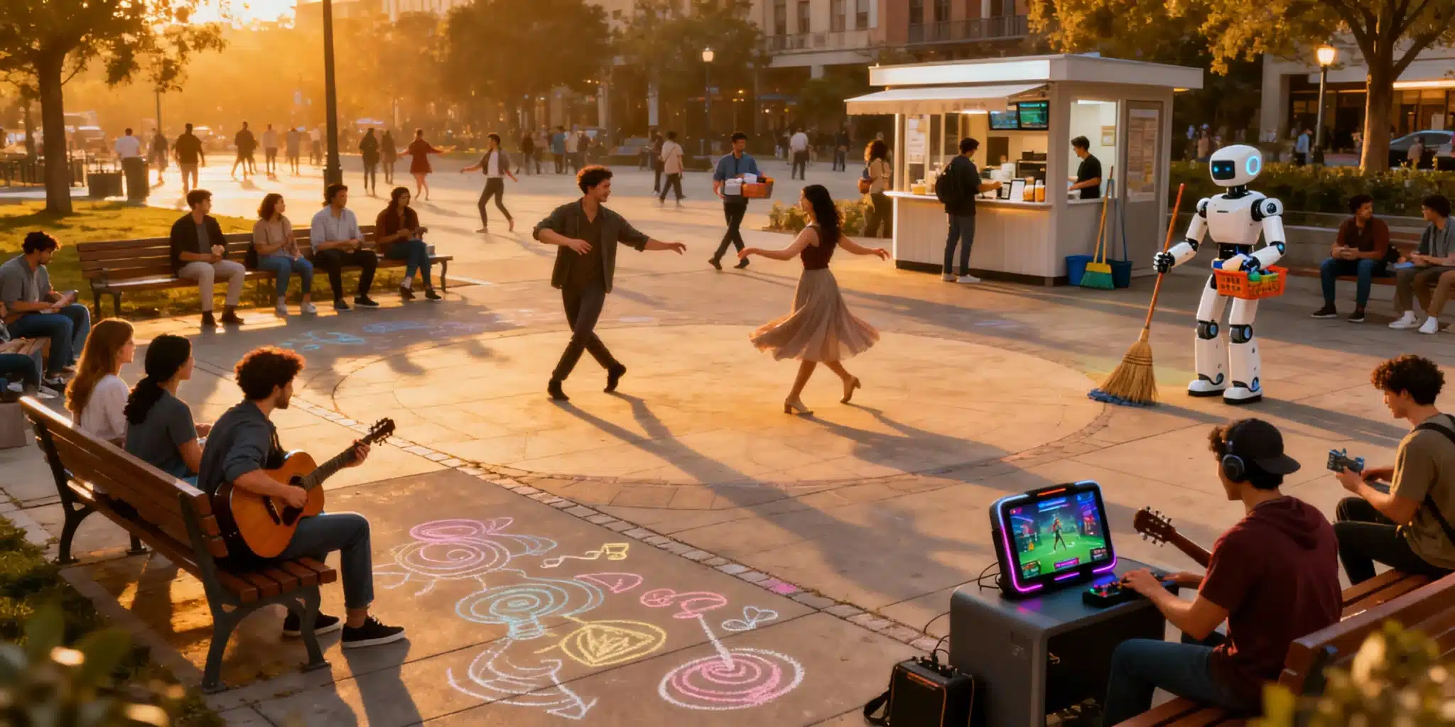 AGIとヒューマノイドがあらゆるインフラと「奉仕的な仕事」をこなす世界では、 生きるための苦役としての労働は急速に縮小していきます。 そのとき残るのは、人間同士の競争・コミュニケーション・楽しませ合いです。