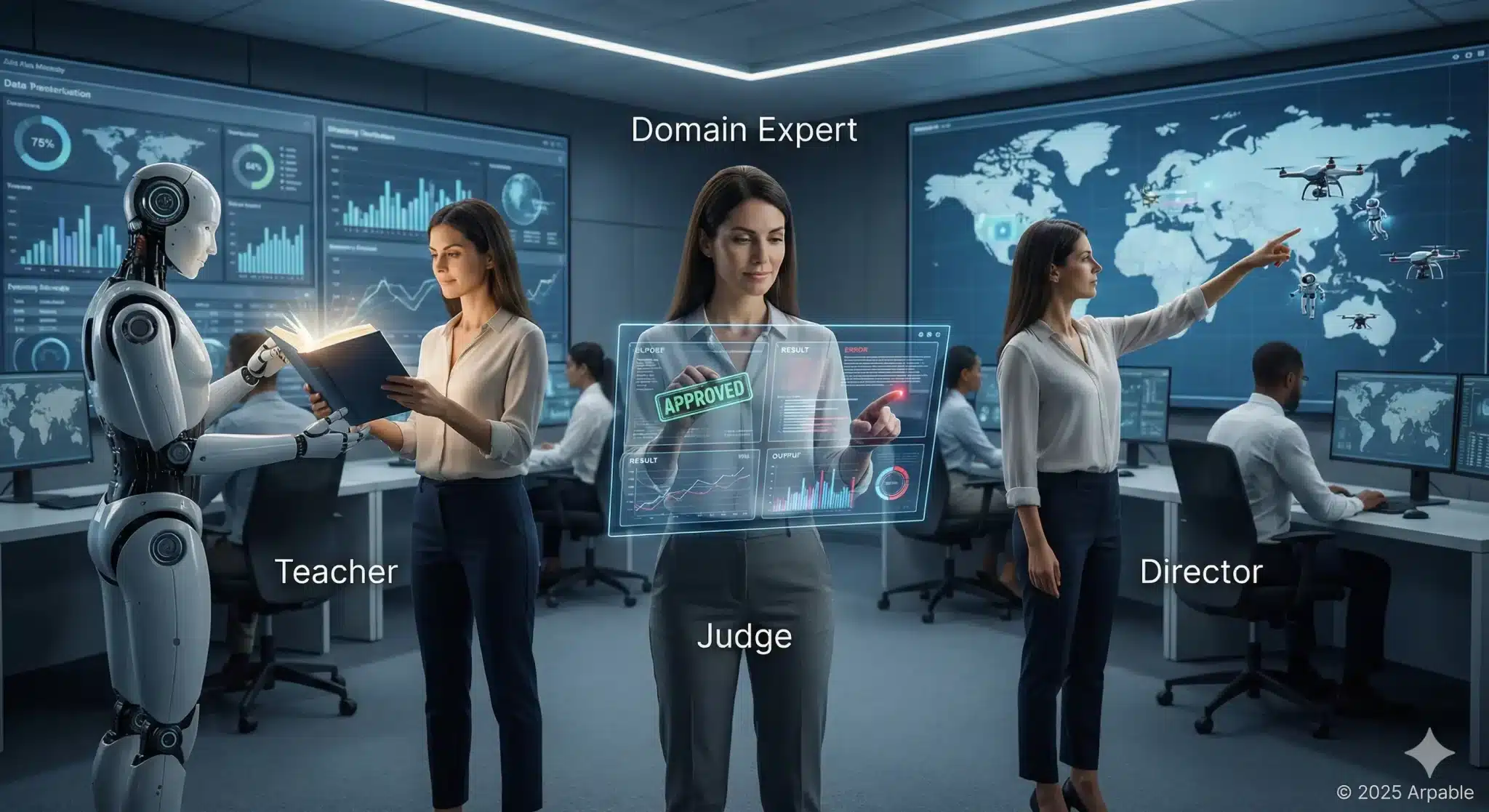 AIのアウトプットを評価・修正する役割です。AI開発の現場では、こうしたプロセスを「Human-in-the-loop(人間参加型)評価」と呼びます。現場での評価結果は、まずはプロンプトやワークフローの改善に生かされ、必要に応じてRLHF(人間からのフィードバックによる強化学習)などの再学習にも活用されていきます。