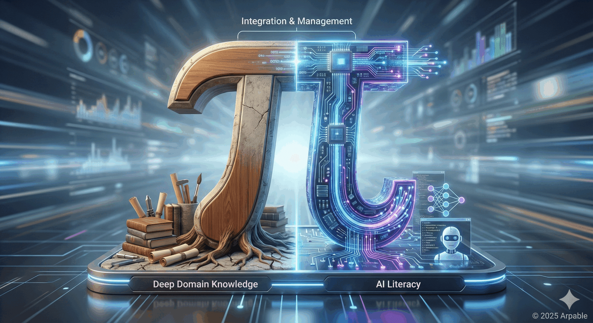 - 2つの異なる専門分野(2本の足)と、それらを統合する広い視野(横棒)を持つ人材のこと。本記事では「業務知識」と「AI活用力」の2つを指す。