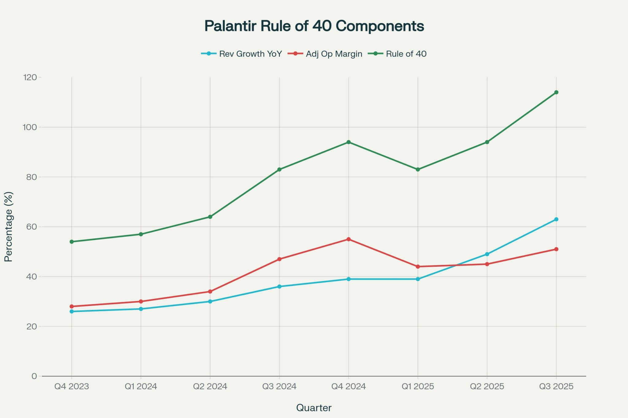 - 直近8四半期連続でRule of 40スコアが拡大—構造的な改善であり、一時的なトレンドではない(Palantir IRが公表する指標ベース)