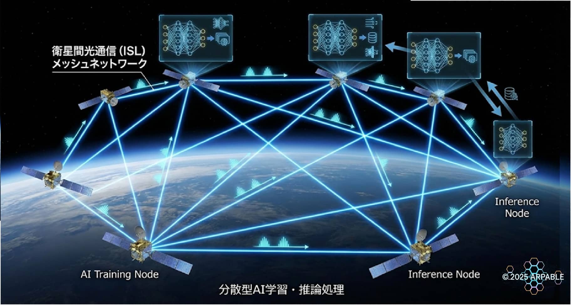 ・宇宙空間では、複数の衛星が「衛星間光通信(ISL)」でメッシュネットワークを形成し、連携して学習・推論処理を行います。