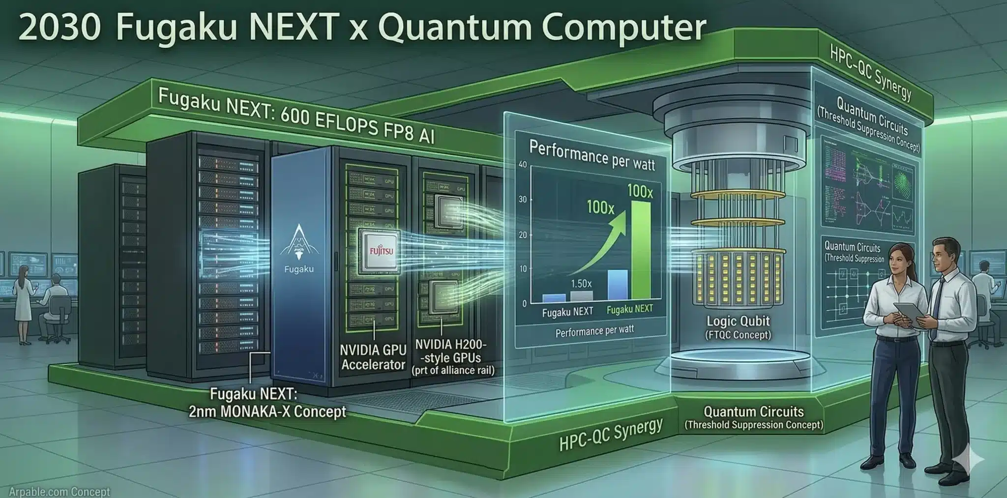2025年8月に正式発表された「富岳NEXT」は、理化学研究所がプロジェクトを総括し、富士通が次世代CPUとシステム設計、NVIDIAがGPUを中心とする計算プラットフォームを提供する形で進む、次世代フラッグシップスーパーコンピュータ計画です。現行富岳が持つ電力効率の高さを引き継ぎつつ、“同等の電力枠で最大100倍のアプリケーション実効性能”を実現することが最大の目標とされています。