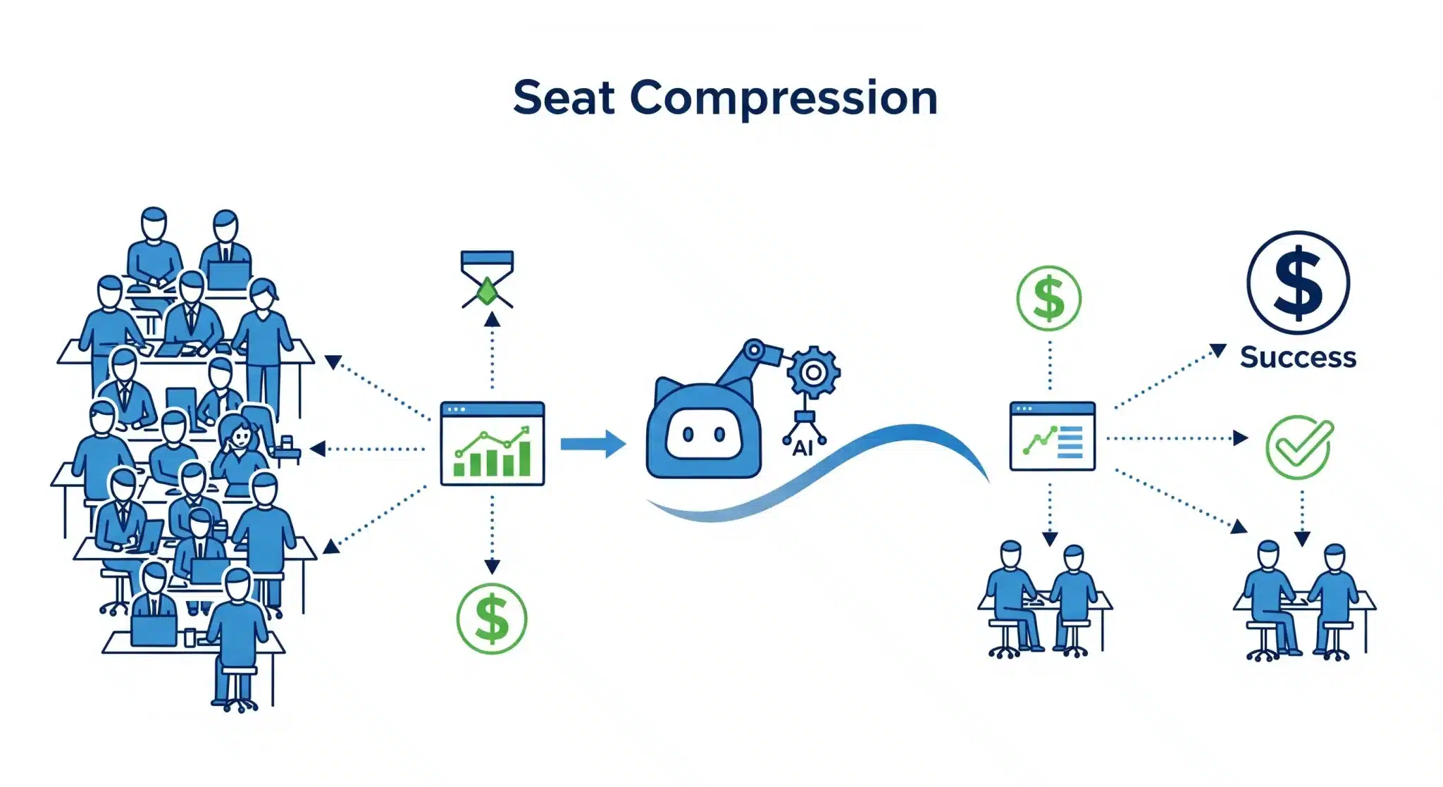 シート圧縮(Seat Compression)とは、シート課金(per-seat pricing)のSaaSで、AIエージェント導入や業務自動化により必要なユーザー数(席)が減り、同じ成果でもARRが伸びにくくなる現象です。